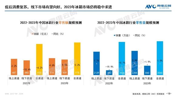 随着国内疫情防控政策放开,线下工厂、销售渠道、物流运输恢复,对于家电市场的线下销售带来利好因素。奥维云网研判,2023年中国冰箱市场稳定发展,行业将迎来恢复性增长。