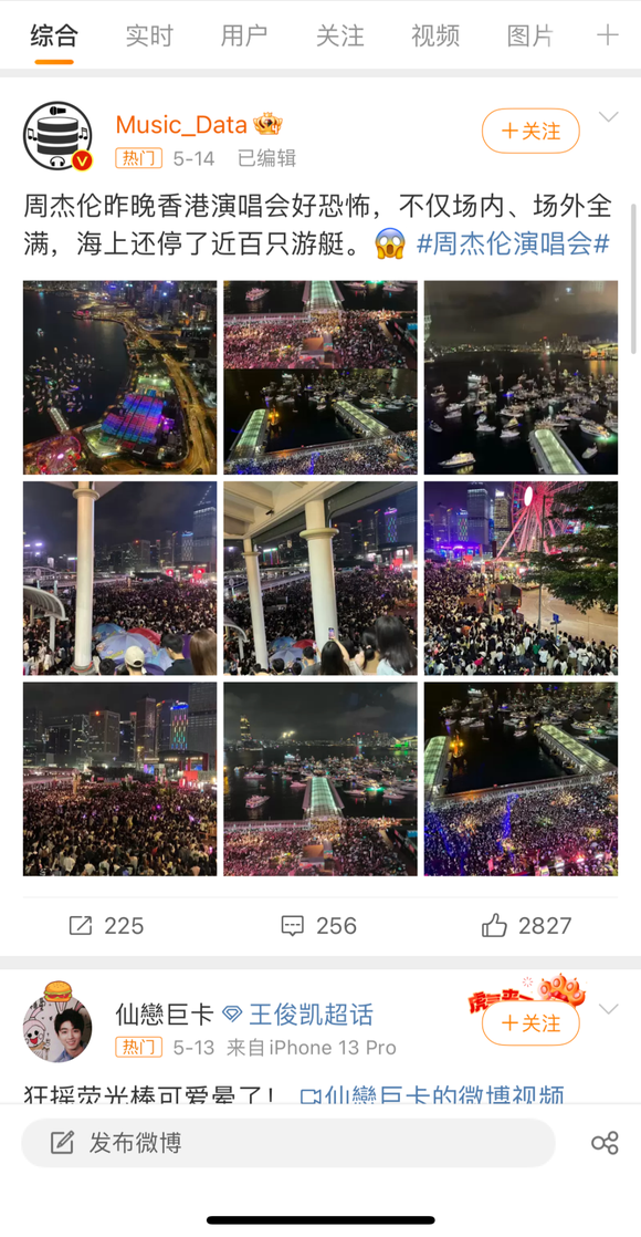 不仅是五月天的演唱会,不久之前,周杰伦演唱会的盛况也同样空前。“5月13日,在香港周杰伦演唱会现场,不仅场内坐满了观众,场外也是人山人海,海上甚至还停了近百艘游艇。”ID为“Music_Data”的微博娱乐博主写道。