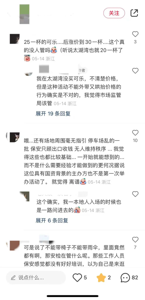 除了太湖湾音乐节,在小红书上,被不少网友吐槽的还包括“浙江德清莫干山奇幻音乐节”。“可乐25元/杯,后来涨到30元/杯”“出租车不打表”“保安只顾收钱,无人维持秩序”。同时,浙江温州的“楠溪江音乐节”也被吐槽,“黄牛走后门剪铁丝入场”等。