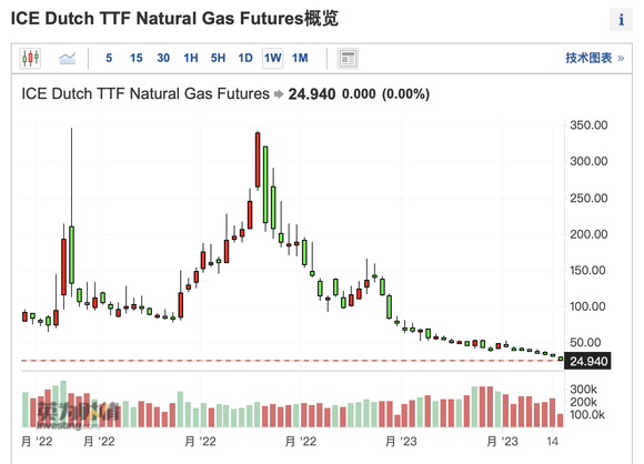 2022年2月底,俄乌冲突爆发后,欧洲天然气期货价格开始飙涨。去年8月一度高达342欧元/兆瓦时;去年9月,TTF期货价格开始逐级回落。