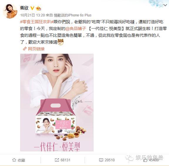 据良品铺子工作人员透露,为拉蒋欣入伙,企业负责人曾带领专业团队,做了大量市场调查与数据分析,从蒋欣的粉丝数量、活跃程度以及在市场中她的品牌形象和商家认知等多个角度,与同类女星进行了全方位的类比。
