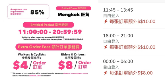 一开始,Foodpanda和Deliveroo 并没有反击。但第三天,也就是5月24日,一位骑手表示,在旺角地区,早上11点到晚上9点,Foodpanda给步行和自行车骑手每笔订单额外加4港元服务费,摩托车和司机骑手每单加8港元服务费。Deliveroo 则不分地区,在11:45-13:45和18:00-21:00两个配送高峰时段,每个订单奖励骑手10港元,并在0:00-6:00运力稀缺阶段每单提供8港元补贴。