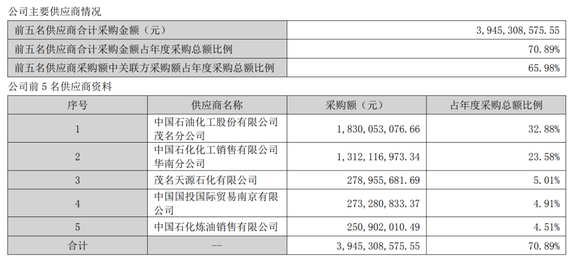 时至今日,ST实华的业绩仍对中石化有较强的依赖性。2022年公司前五大供应商占年度采购总比例的70.89%,其中前两大供应商分别是中石化茂名分公司、中石化化工销售华南分公司,合计采购额占总比例的56.46%。同时,中石化关联公司还是ST实华的第一、第三、第四大客户,合计占总销售额的31.86%。