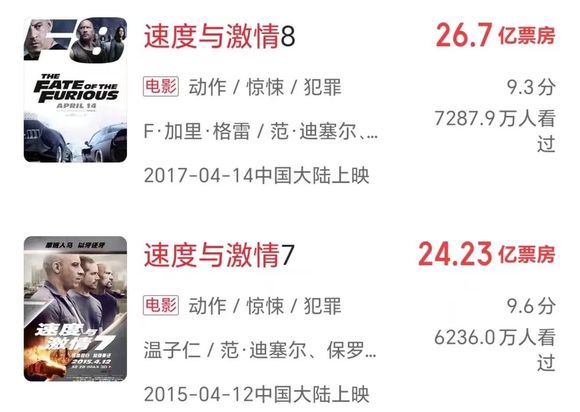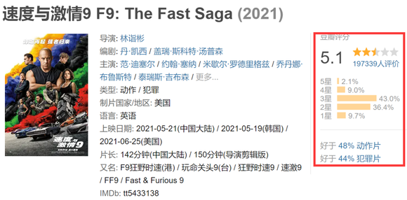 比《速激7&8》均低了10亿有余不说,豆瓣评分也低到史无前例,只有5.1。