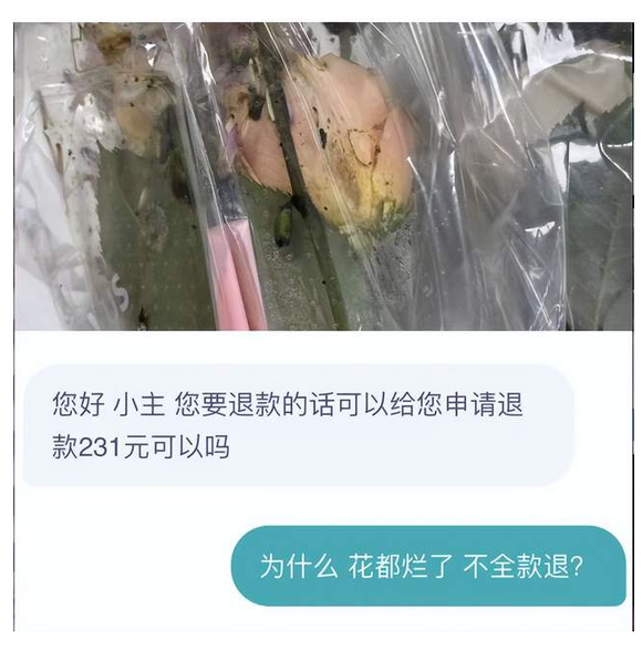 首先是让我发送烂花根的照片,在我发送后,对方说道,两束花只有一束烂了呀。此时我的火气直升,“你的意思是全要烂成泥才能退吗?”可能是感受到我的态度强硬,对方没再多说,便开始发起退款程序。