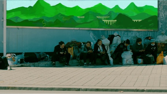 比如绘画作品呈现的多是来自川西的农民工或快递员,影像作品《从山脉到海岸》则结合了拍摄与手绘动画,既回忆了他童年第一次出远门的经历,也勾勒出一条改革开放后从西南山区到南部沿海的人口流动之路。余果说:“私人回忆里有许多被忽略的东西,但我觉得它们具有连接性,是每个人都有的普遍经验。”时长近一个小时的影像作品《群山》来自他在新疆为期两个月的驻地项目,余果称之为“论文电影”,他试图拼贴的是汉语语境对于边疆的塑造过程。