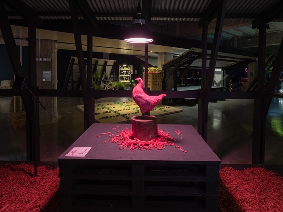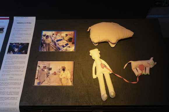 作品《粉红鸡计划》告诉观众,每年有600亿只鸡被宰杀和食用,埋藏于地球岩层的鸡骨已经成为人类世的主要标志。以此为背景,艺术家提出用胭脂虫的粉红色素改造鸡的基因,这会将人类的地质痕迹染成粉色。这一作品体现出对社会正义与生态正义的追问——用鸡肉喂饱更多人是一种正义,但对于鸡来说又是否正义?《MYBIO玩偶》也思考了相似的伦理问题,艺术家埃利奥·卡卡瓦莱设想了这样的未来:人们为了建器官银行而养宠物猪,为了保证猪日常的健康快乐,卡卡瓦莱为它们设计了12件精美的玩具——这些玩具代表着温馨还是残忍?