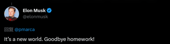 OpenAI的创始人之一马斯克曾在社交媒体平台上称赞ChatGPT:“It's a new world. Goodbye homework!”