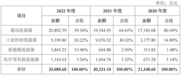 2020年至2022年(报告期),盛凌电子的营业收入分别为2.30亿元、3.33亿元和3.77亿元;扣非后归母净利润分别为3130.34万元、4936.37万元和7024.79万元。从收入构成看,公司报告期通讯连接器收入占比有所下滑,而工业控制连接器、新能源连接器的收入占比则相应上升。