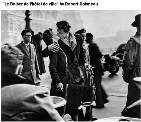 这张刊登在美国《生活》杂志上的照片,记录下了一对年轻恋人在巴黎市政府广场前的忘情一吻。摄影师询问他们是否可以在镜头前接吻,相爱的两个人欣然接受了这一要求。