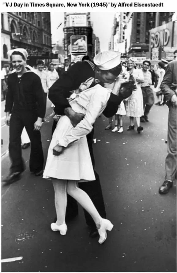 1945年8月15日正午,日本天皇宣布无条件投降,在V-J Day(Victory over Japan Day)人们走上街头庆祝二战结束这一历史性时刻,这个吻堪称二战最经典的影像瞬间。