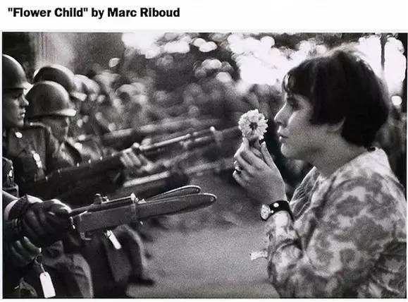 “在和国民警卫队对峙了一整天以后,傍晚,这个神奇的姑娘拿着一朵小花儿出现了……”,在尖队的看来,这幅照片还有另外一种解释:字面意义的美女与野兽。