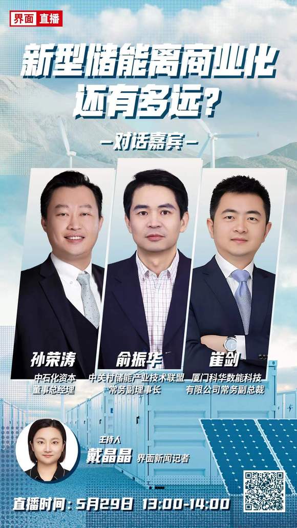 日前,界面新闻直播邀请行业专家、投资机构和储能头部企业对上述问题进行了深入探讨。他们分别是中关村储能产业技术联盟常务副理事长俞振华、中石化资本董事总经理孙荣涛和厦门科华数能科技有限公司常务副总裁崔剑。