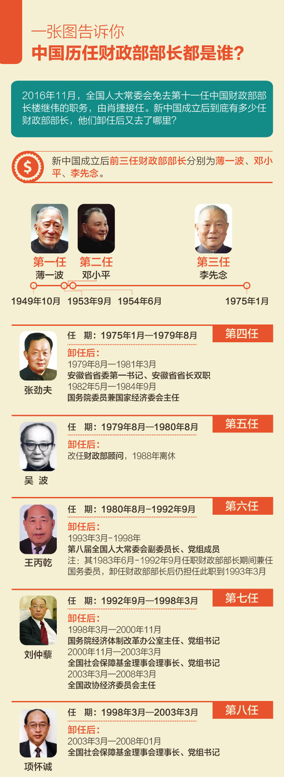 2016年11月,全国人大常委会免去第十一任中国财政部部长楼继伟的职务,由肖捷接任。新中国成立后到底有多少任财政部部长,他们卸任后又去了哪里?