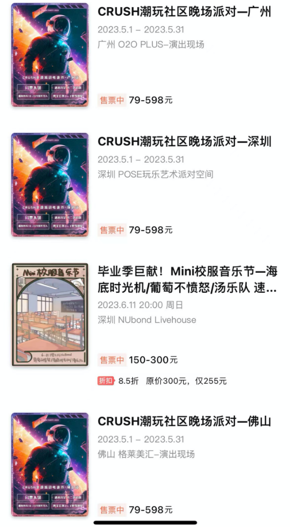 从今年3月开始,每个月都有三十多场音乐节活动。今年2到3月份,大麦平台上在售的音乐节超过100个,演出合计超290场,票房规模与2019年同期相比提升了11倍,购票人次同比提升了9倍。