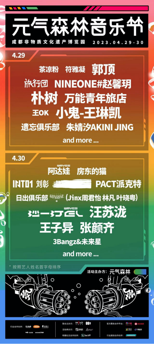 值得注意的是,一些消费品品牌也亲自下场搞起了“跨界”音乐节。五一假期期间,元气森林邀请了朴树、汪苏泷、郭顶、旅行团等歌手和乐队在成都举办了一场“元气森林音乐节”,而蜜雪冰城则在武汉办了一场“冰淇淋音乐节”。隅田川咖啡则在5月20日、5月21日于杭州主办了“隅田川潮咖音乐节”。
