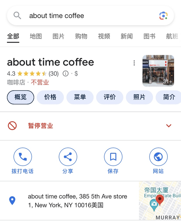 截至目前,拥有银底红字门头的About Time Coffee在美共有5家门店,分别在1450 broadway, 385 5th Ave,303 Park Ave south, 355 7th Ave,315 Madison Ave。