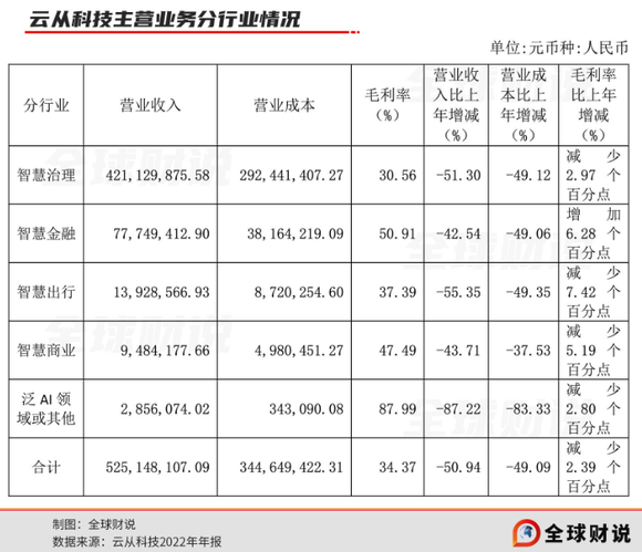 根据营收结构看,2022年云从科技主营业务“全军覆没”,在营收收入全面下滑的同时,毛利率也均呈现缩减态势。