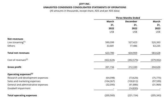 5月31日消息,欢聚集团发布了截至2023年3月31日的第一季度业绩报告,财报显示,该公司在今年一季度实现营收5.836亿美元,上年同期为6.238亿美元,同比下降6.44%。
