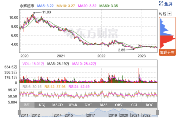 令人好奇的是,作为现有门店数量破千家的零售超市,二级资本市场也“用脚”投票,永辉超市整体股价从2020年的11元/股的高位一路走低,目前徘徊在3元/股左右的价格。