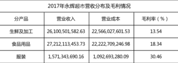 2017年永辉超市营收分布及毛利情况;制表:乾行