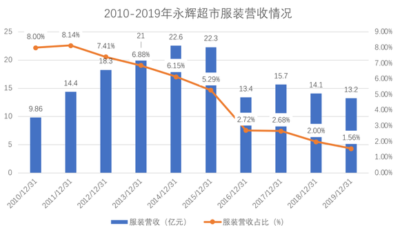 2010-2019年永辉超市服装营收情况;制图:乾行