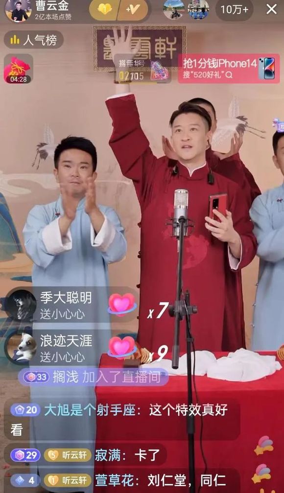 自4月开始在直播间说相声后,曹云金直播间的人气暴涨,单场直播在线观看人数常常突破10万+、点赞破亿,曹云金的直播间相声已成“大势”,成为备受瞩目的现象级直播间。