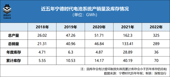 「探客出行」从宁德时代年报发现:在2022年动力电池迎来库存压力的背景下,宁德时代的总产量达325GWh,同比增长100.25%;总销量约289GWh,同比增长116.63%;年库存量达36GWh,同比增长24.61%;累计库存达70GWh,同比增长74.17%。