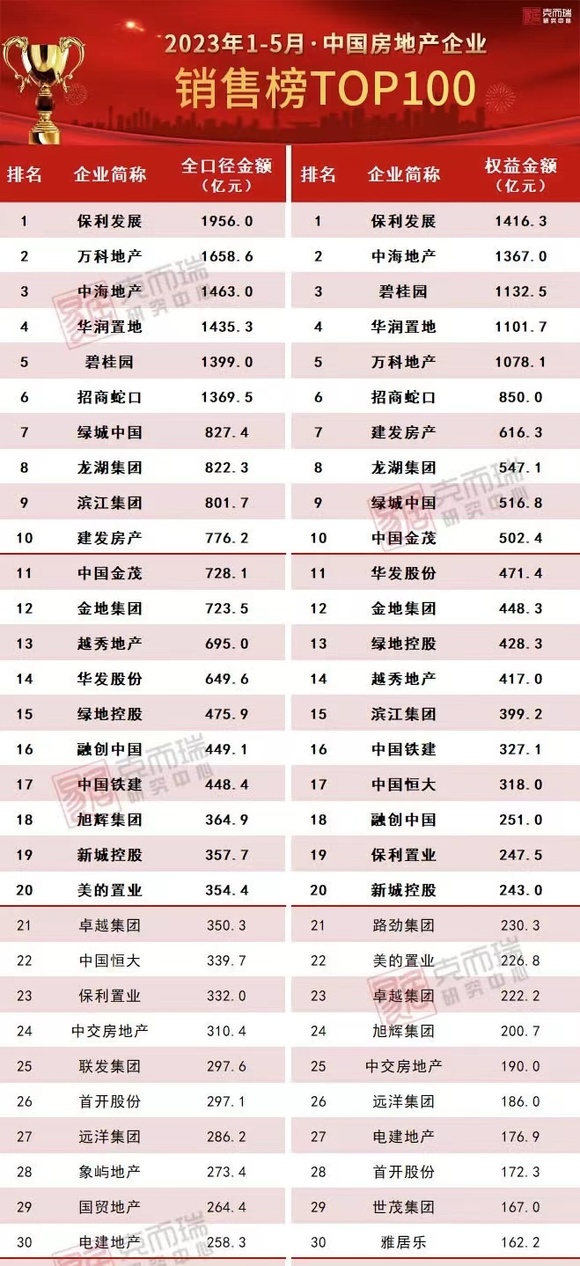 中指研究院数据显示,今年1-5月保利发展实现全口径销售额约为1956亿元,同比增长22.9%,高出第二的万科近300亿元。