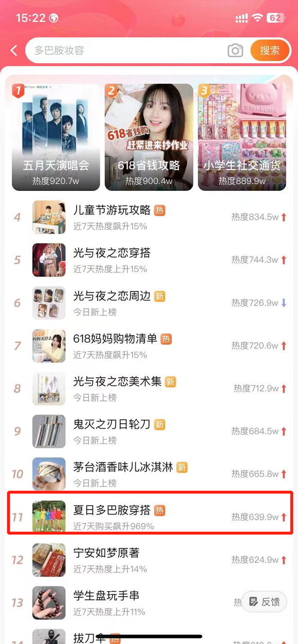 从最初的照片视频到传播后的再创造,网络迷因效果不断将“多巴胺穿搭”扩散开来,在淘宝热搜榜单中,夏日多巴胺穿搭话题热度为639.9w,相关商品近七天购买飙升969%。