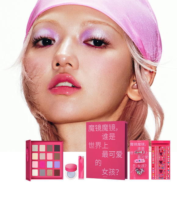 其中,涩女郎「天真妹」套装,搭配一支鲜嫩欲滴的草莓粉色「天真粉」口红、一颗放飞想象力的天蓝色「想象力」面部多用膏、配色是冷粉、玫粉、蓝紫与大闪碰撞的眼影盘,集齐了来自千禧年的多巴胺电波。