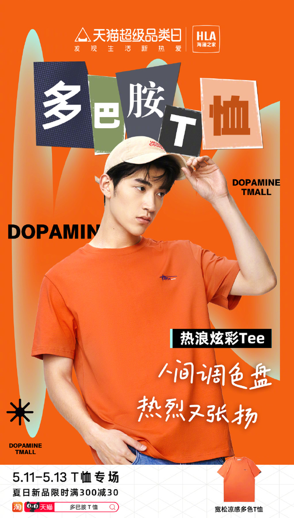 5月11日至13日,上天猫搜索「多巴胺T恤」,即可享受满300减30的优惠。