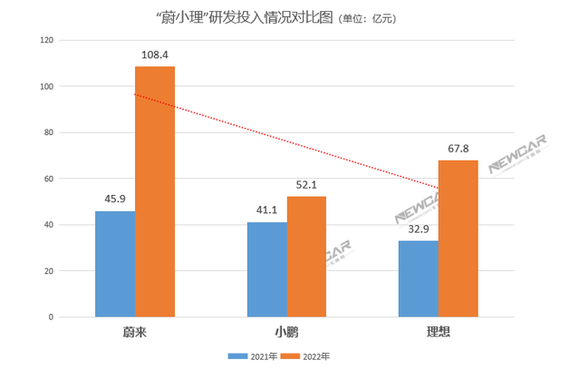 数据显示,蔚来、理想、小鹏三家车企在2022年的研发投入分别为108.4亿元、67.8亿元、52.1亿元。2023年,三家企业还将会进一步提升研发投入。