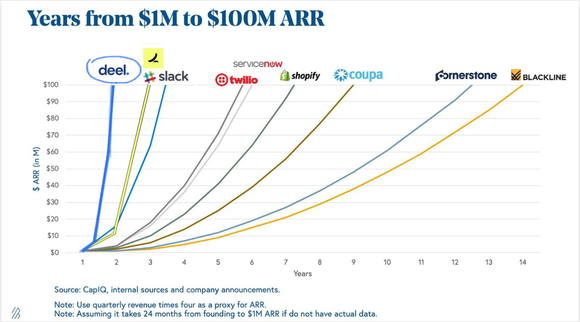 很快,借着疫情和远程办公的东风,成立仅20个月,Deel就实现了ARR由100万美元到1亿美元的百倍增长,增速超过Slack、Shopify、Twilio等多家以增长迅速闻名的SaaS独角兽公司,而且刷新了Slack24个月ARR破亿的记录,成为世界上增长最快的SaaS企业。