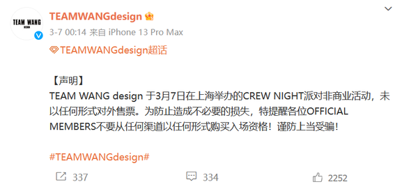 根据TEAMWANG的定义,这次非公开的聚会更像是一次文化与商业圈层的交流会,「CREW NIGHT」是TEAM WANG design为各领域与品牌有着共同愿景的人提供的平台,藉此融合并集结多元化、跨领域的人群,构建一个共同成长与持续发展的圈层。」