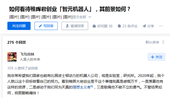 关于稚晖君做AI机器人创业一事,在知乎有一个关于“如何看待稚晖君创业智元机器人,其前景如何?”的问题板块,不少专业人士对此事从态度和专业的角度分别发表了各自的看法。
