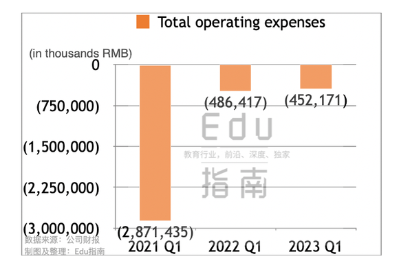 最新财季高途公司总营业费用为4.5亿元,同比上一财年同期的4.9亿元,减少7%。高途公司该项费用2021财年Q1为28.7亿元。近两个财年Q1该项显著下降。季报称,该费用下降是因为公司优化员工结构,提高运营效率,员工相关费用、租赁费用、折旧费用等运营费用同比下降。