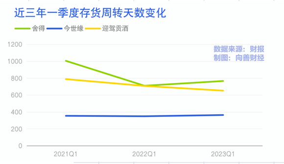 舍得酒业周转天数从709.78天增加到了765.96天,增加了56天,将近两个月。周转情况最好的是迎驾贡酒,2022年一季度是707.55天,2023年则是651.70天,存货周转加快了55.8天。