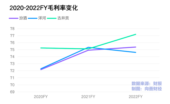 洋河股份方面,2020-2022三年的毛利率表现分别为72.27%、75.32%、74.60%;