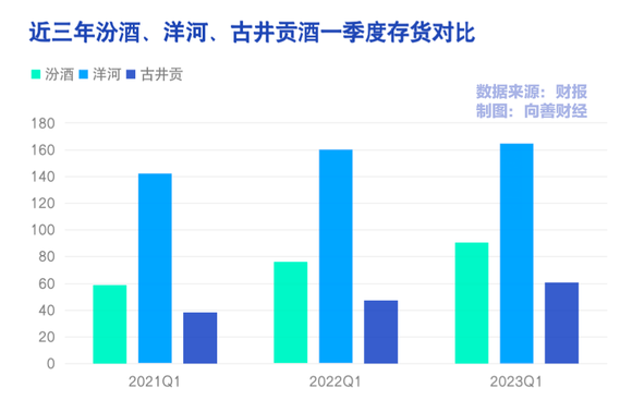 结合存货来看,一季度山西汾酒的存货同比增加了19.30%,来到90.5亿;洋河股份的存货增加相对较少,为3%,但存货货值为164.55亿,古井贡酒一季度存货同比增加27.9%为60.53亿。也就是说,山西汾酒与古井贡酒的存货压力比洋河可能要更多一些。
