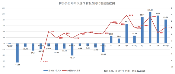 一个衡量指标是,即使不再激进地花钱投入,拼多多的收入依然能保持上涨,维持着利润的稳定。前不久发布的2023年第一季财报就是注脚。