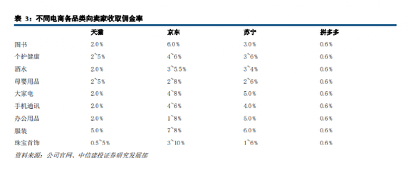 2018年9月,中信建投证券研究发展部曾对各电商平台各品类的卖家收取的佣金率进行对比,其中拼多多的佣金率是最低的,只收取「0.6%的技术服务费」。