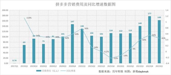 更直观的营销费用,本季度却并没有显著增加,反而比上一季度少支出了14亿元,增速也低于上一季度的56%。