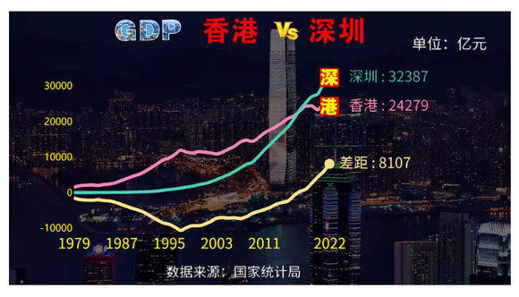 1979年时,香港的GDP是深圳的400多倍。40年后,深圳的GDP最终超过香港,并且以一个迅猛的姿态,不断拉开与香港之间的差距。到2022年,深圳GDP同比增长3.3%至32387.68亿元,而按照港元计价的香港GDP同比却下滑了3.5%。