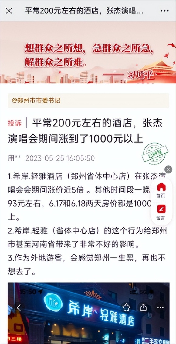 近日,有网友在顶端新闻@领导栏目投诉,希岸·轻雅酒店(郑州省体育中心店)在张杰演唱会期间涨价近5倍,其认为这种行为给郑州带来了非常不好的影响。