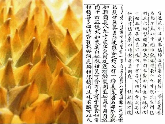 途径南洋一海岛时,郑和发现了一堆庞大而浑身长刺的水果,大家争相品尝,愁绪一扫而空。郑和身边的通事马欢还将其记录了下来,形容为“如中国水鸡头样,长八九寸,皮生尖刺,若臭牛肉之臭,内有栗子大酥白肉十四五块,甚甜美好吃。”
