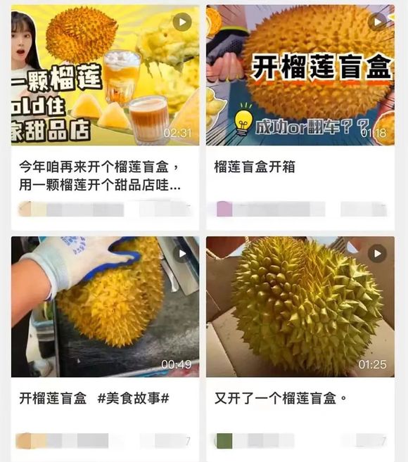 如今的各大短视频平台,还催生出了“榴莲盲盒”的玩法。抖音上“榴莲盲盒”的相关话题有接近50亿次的播放量,小红书上有逾7万篇“开榴莲”相关笔记,有网友调侃:“当代三大合法赌博:烫头、结婚、买榴莲。”