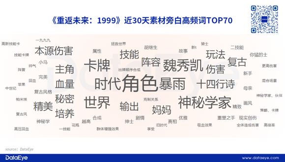 DataEye-Tidea旁白高频词TOP70数据显示,“角色”是近30天《重返未来:1999》素材旁白出现的高频词,同时游戏角色的名称也是高频词汇。另外,“技能”“玩法”“培养”也是高频词汇。