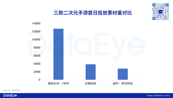 DataEye-ADX投放数据显示,《重返未来:1999》上线爆发阶段,首日投放量直接超过1.3W组素材。作为参考,《无期迷途》《崩坏:星穹铁道》都大幅低于该游戏。