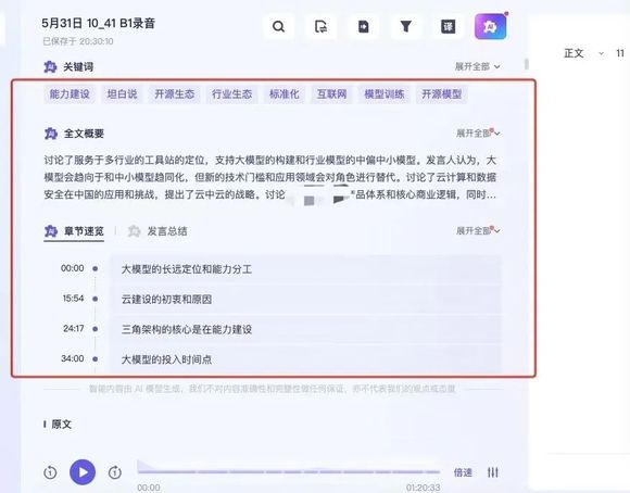虽然在听上,听悟从此次测试比对上总体看略逊色于讯飞听见,但悟的理解及分析能力着实让人眼前一亮,就猎云网提供的录音来看,听悟在全文概要、章节速览以及关键词提取上除了个别字眼的错误外,整体较为准确,对于文字工作者来说其增效明显。
